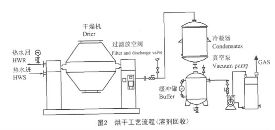 (2)蒸汽或热水加热,需要溶剂回收工艺流程,与不需要回收溶剂工艺流程相比,添加了冷凝器及相应的溶剂回收装置,如图2